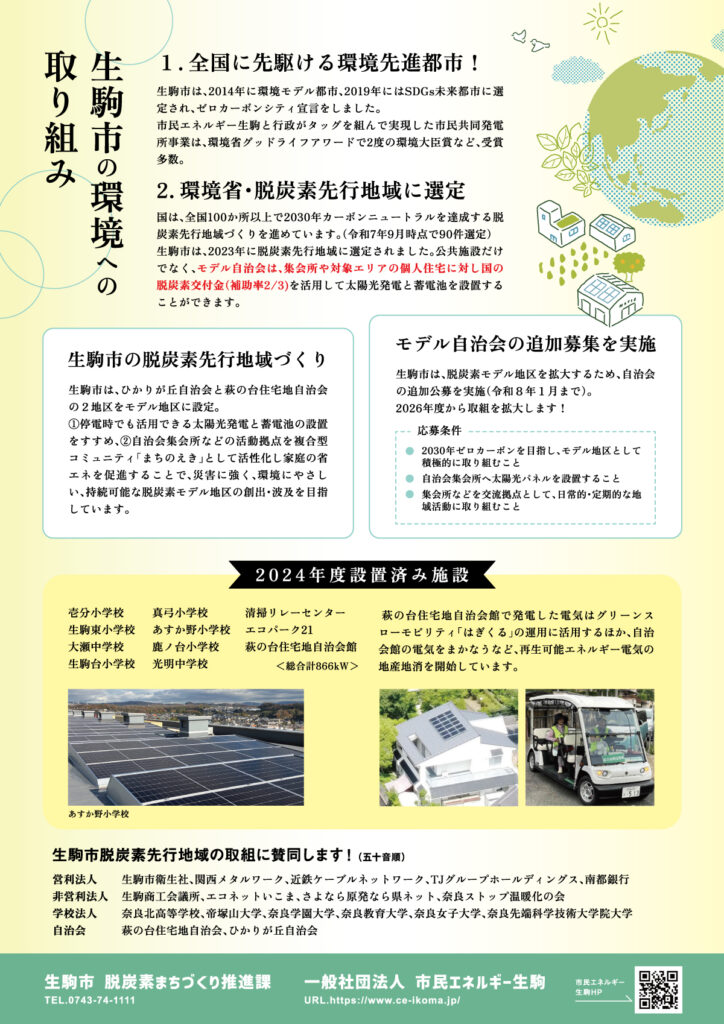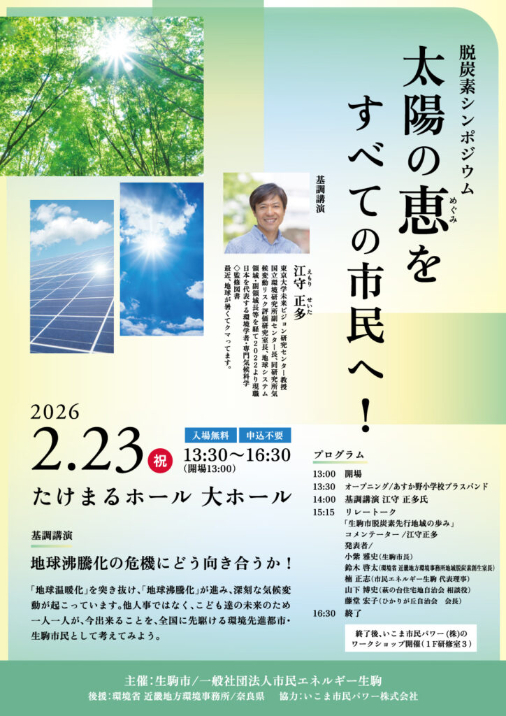 生駒市および一般社団法人市民エネルギー生駒の共催で、“太陽の恵みをすべての市民へ”と題し、2026年2月23日月曜日(祝日)13時30からたけまる大ホールにてシンポジウムを開催いたします。日本を代表する環境学者の 江守 正多氏も、オンラインではなくご本人が登壇されます。奮ってご参加くださいますようお願い申し上げます。